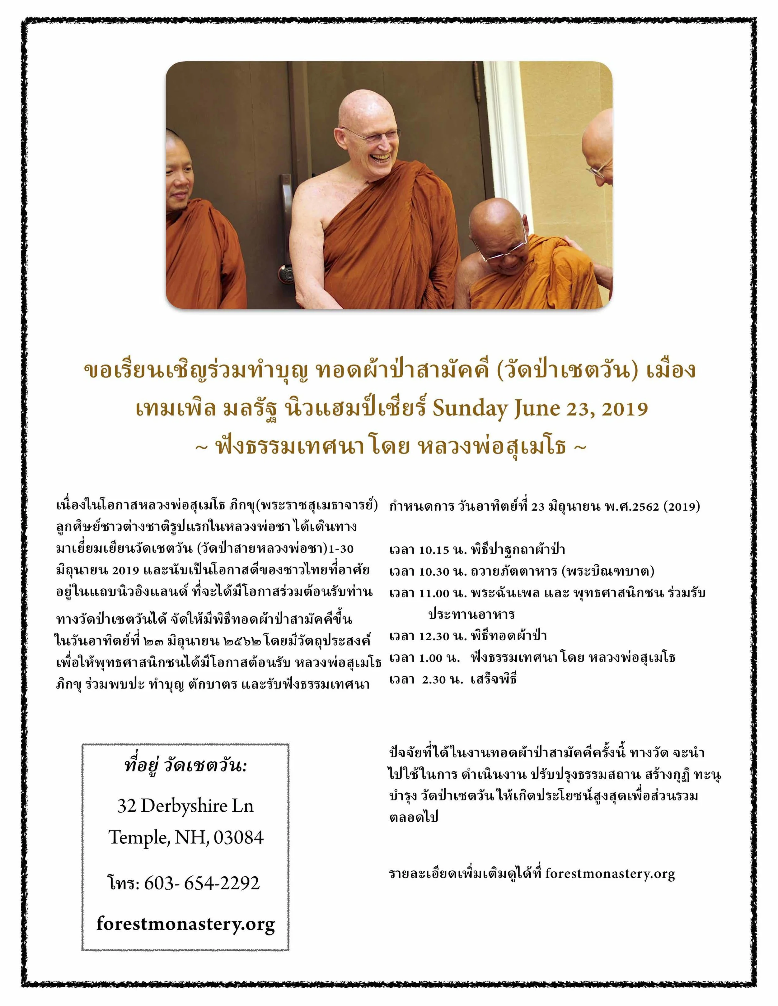 เนื่องในโอกาสหลวงพ่อสุเมโธ ภิกขุ(พระราชสุเมธาจารย์) ลูกศิษย์ชาวต่างชาติรูปแรกในหลวงพ่อชา ได้เดินทาง มาเยี่ยมเยียนวัดเชตวัน (วัดป่าสายหลวงพ่อชา)1-30 มิถุนายน 2019 และนับเป็นโอกาสดีของชาวไทยที่อาศัยอยู่ในแถบนิวอิงแลนด์ ที่จะได้มีโอกาสร่วมต้อนรับท่าน